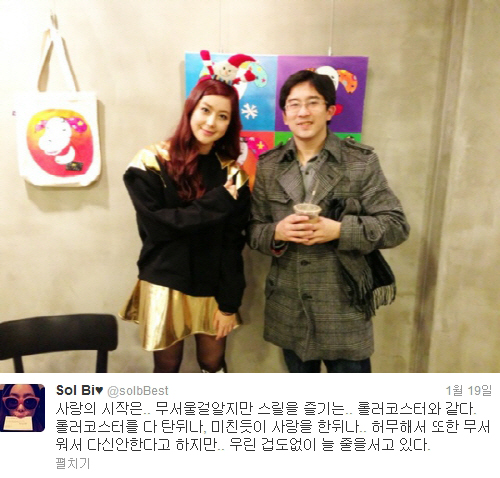 가수 솔비는 지난 19일 트위터에 "사랑의 시작은 무서울 걸 알지만 스릴을 즐기는 롤러코스터와 같다. 롤러코스터를 다 탄 뒤나 미친 듯이 사랑을 한 뒤나 허무해서 또한 무서워서 다신 안한다고 하지만 우린 겁도 없이 늘 줄을 서고 있다"는 글을 게재했다.