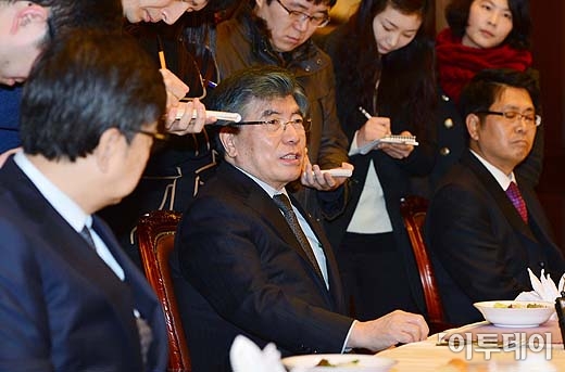 김중수 한국은행 총재가 22일 오전 서울 중구 남대문로 한국은행 본관에서 열린 ‘경제동향간담회’에서 참석자들과 이야기를 나누고 있다. 이날 간담회에는 최운규 경제연구원장, 조동철 KDI 국제정책대학원 교수, 조준모 성균관대 교수, 김창로 한국석유화학협회 상근부회장, 박우규 SK경영경제연구소장, 채욱 대외경제정책연구소장, 박영탁 한국기계산업진흥회 상근부회장 등이 참석했다.