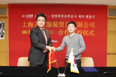 ▲손수근 신원 사장(왼쪽), 피아오쩡즈(朴正植) 정영복장유한공사 회장