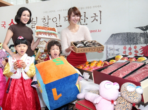 우정사업본부 우체국쇼핑이 2013년 계사년 설을 맞아 22일 오전 중구 충무로 서울중앙우체국에서 ‘2013 우체국쇼핑 설 할인대잔치’를 알리는 행사를 열고 있다. 우정사업본부는 지난 21일부터 내달 4일까지 사과, 배, 한과, 곶감 등 우리 농·수·축산물 약 5700여종을 20% 할인 판매한다.