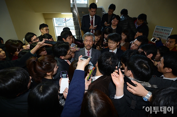 제18대 대통령직인수위원회가 22일 오후 삼청동 인수위원회 공동기자회견장에서 정부 조직개편 후속조치를 발표했다. 유민봉 국정기획조정분과위원회 간사가 취재진에 둘러싸여 질문에 답하고 있다. 노진환 기자 myfixer@
