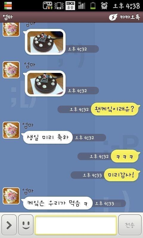 공개 된 사진 속에는 엄마와 딸의 다정한 대화가 담겨 있다. 엄마가 딸에게 카카오톡으로 "생일 미리 축하" 라는 글과 케이크 사진을 찍어 딸에게 축하 메시지를 전송하자 딸은 "왠 케잌이래유? ㅋㅋㅋ 미리 감사!"라고 화답한다. 그러자 엄마의 대답이 반전이다. 엄마는 "케잌은 우리가 먹음ㅋ" 이라는 메시지를 보내 딸에게는 사진만 전송하고 케이크는 엄마가 먹겠다고 통보 해 버린 것.