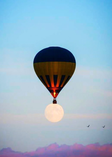 열기구는 커다랗게 떠 있는 달 위를 절묘하게 지나고 있다. 이 모습은 마치 달에 착륙한 것처럼 보여 네티즌들의 시선을 사로잡는다.