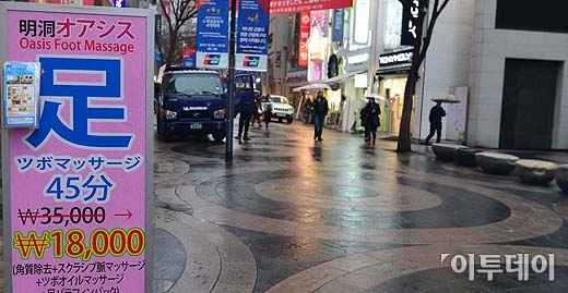 엔화에 대한 원화 절상폭이 달러화의 두 배를 상회하는 등 엔화대비 원화 강세가 지속되면서 한국을 찾는 일본인 관광객 수가 줄어들고 있다. 23일 오전 서울 중구 명동거리는 세일기간임에도 불구하고 비까지 겹치면서 한산한 모습을 보이고 있다.