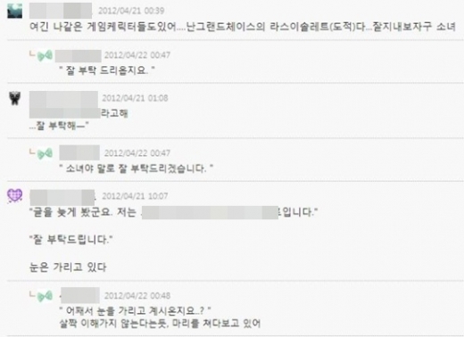 공개된 사진에는 새로 카페에 가입한 회원들이 인사말을 전하자 여성으로 보이는 운영자는 '잘 부탁드리옵지요' '소녀야 말로 잘 부탁드리겠습니다' '어째서 눈을 가리고 계시온지요?' 등 사극에서나 볼 법한 극존칭 인사로 답해 웃음을 자아냈다.