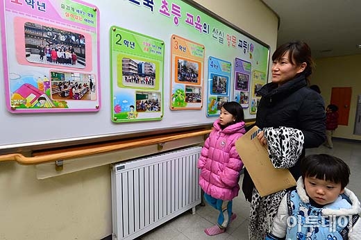 2013학년도 초등학교 취학아동 예비소집일인 23일 서울 종로구 경운동 교동초등학교에서 예비초등학생들이 학부모와 함께 학교를 둘러보고 있다. 서울시 교육청에 따르면 저출산과 도심 공동화 현상으로 서울에서 신입생이 50명 미만인 초등학교가 35곳에 이르는 것으로 나타났으며 서울 교동초등학교는 올해 15명이 입학하여 서울에서 신입생이 가장 적은 학교가 되었다.