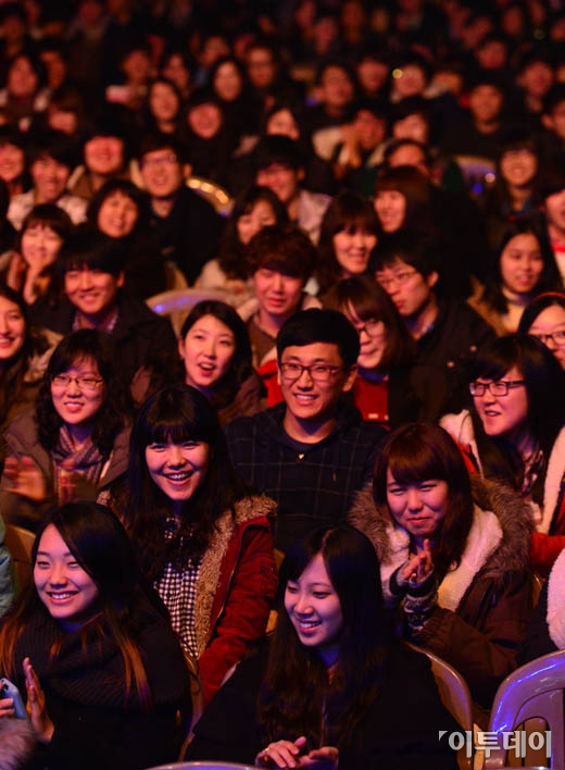 한양대학교 신입생들이 23일 서울 성동구 캠퍼스내 올림픽체육관에서 열린 2013년도 신입생 환영회 '뉴 라이온 킹 페스티벌'에서 밝게 웃고 있다.