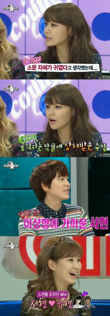 이날 방송에는 걸그룹 소녀시대 멤버 전원이 출연해 숨겨둔 입담을 뽐냈다. 특히 멤버 수영은 얼마전 불거진 톱스타 원빈과의 열애설에 대해 해명해 눈길을 끌었다. MC 규현(슈퍼주니어)은 멤버 서현을 자신의 이상형에 가까운 멤버라고 꼽기도 했다.