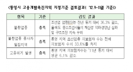 주력업종이 조선업인 통영시는 계속된 불황으로 피보험자 수가 지난 3개월간 평균 6.1% 줄어드는 등 고용량이 현저히 감소된 것으로 나타났다. 이에 통영시는 중앙정부에 ‘고용개발촉진지역’으로 지정해 줄 것을 요청했다.