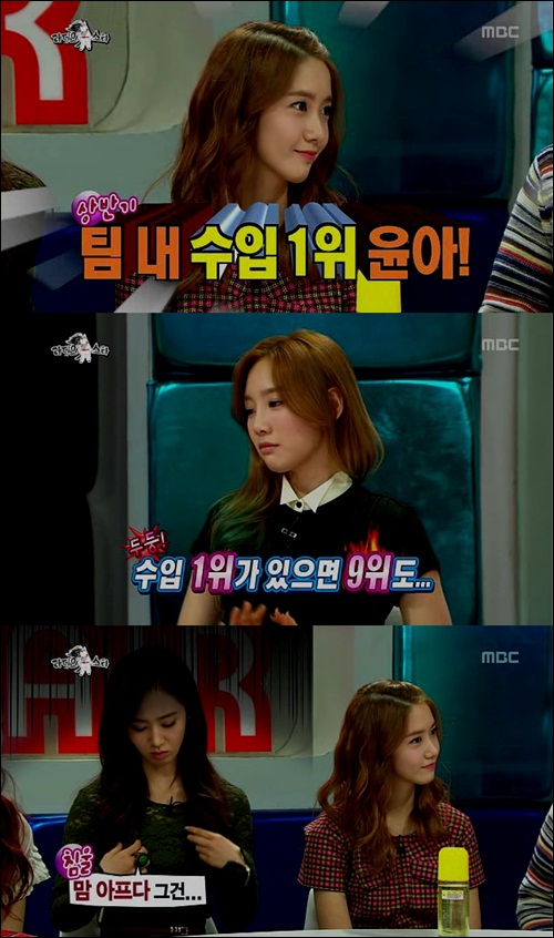 이날 방송에서 MC 김국진은 "윤아가 소녀시대 상반기 팀 내 수입 서열 1위였다. 확실하냐?"라고 묻자 효연은 고개를 끄덕이며 "그렇다. 너무 보여지는 거 아니냐"고 답했다.