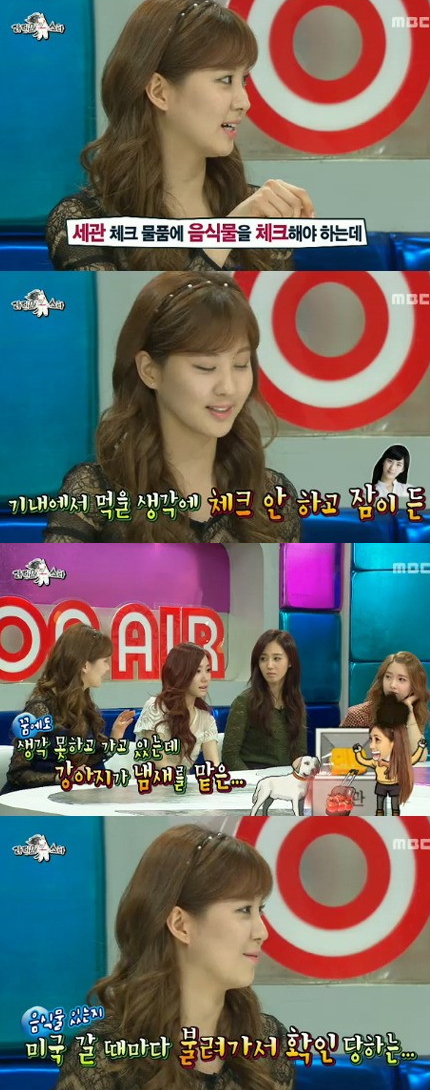 이에 서현은 "기내에서 먹으려고 방울토마토를 싸갔다. 세관 체크 물품에 음식물을 체크해야 하는데 체크 안 하고 잠이 들었다"면서 "나중에 방울토마토가 있다는 사실을 잊어버렸는데 공항 탐색견이 냄새를 맡아 세관에 걸렸다. 그 후로 블랙리스트에 올라서 미국 갈 때마다 음식물이 있는지 불려가서 확인을 당한다"라고 설명했다.