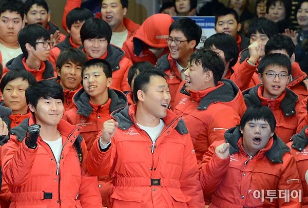 2013 평창 동계 스페셜올림픽 세계대회 한국대표선수단 출정식이 24일 오후 용산구 국립중앙박물관에서 열렸다. 출정식에 참석한 한국대표선수들이 선수단 소개에 파이팅을 외치고 있다. 노진환 기자 myfixer@