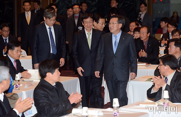 진영 대통령직인수위원회 부위원장이 24일 서울 여의도 중소기업중앙회를 찾아 현장 방문하며 김기문 중소기업중앙회 회장과 회의장에 들어서고 있다. 노진환 기자 myfixer@