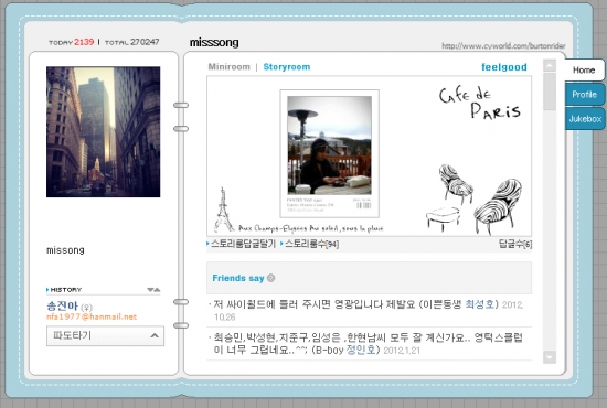 이전까지만 해도 그녀의 미니홈피에는 사진첩 방명록 다이어리 등의 메뉴가 열려있었다. 하지만 현재는 쥬크박스(음악폴더)만 열려있는 상태다.
