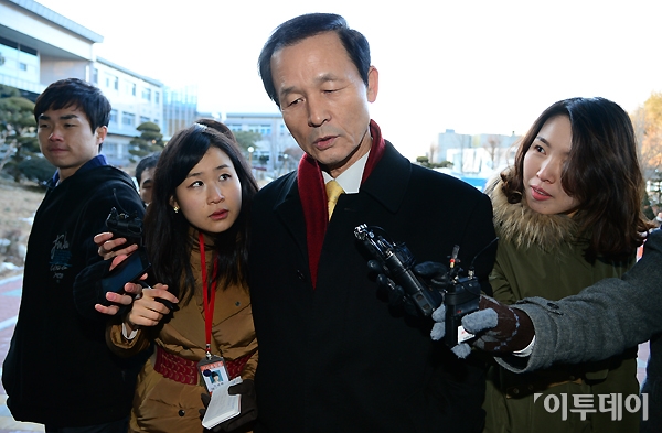 김장수 외교국방통일분과 간사가 25일 오전 서울 종로구 삼청동 대통령직인수위원회로 출근하며 취재진들의 질문에 답하고 있다. 노진환 기자 myfixer@