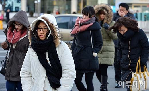서울 아침 기온이 영하 9.8도 체감온도는 영하 17도까지 떨어지며 한파주의보가 내려진 25일 오전 서울 광화문네거리에서 시민들이 몸을 움츠린채 출근을 서두르고 있다.