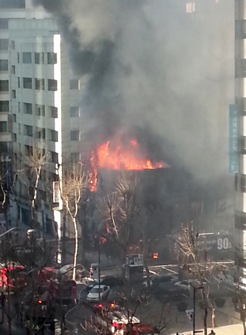 한편 서울교통정보센터는 이날 트위터(@seoultopis)를 통해 "낮 12시를 기해 테헤란로 강남역방향(포스코사거리→선릉역) 건물화재 진화작업으로 현재 전면통제되고 있다. 우회운행 해달라"며 "지하철 2호선 선릉역은 전철운행 이상없이 정상운행된다"고 설명했다.