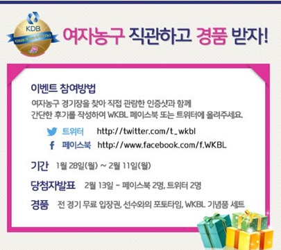 이번 이벤트는 경기장을 찾아 직접 관람한 팬들이 인증샷과 함께 후기를 작성해 WKBL 페이스북이나 트위터에 전달하면 된다.