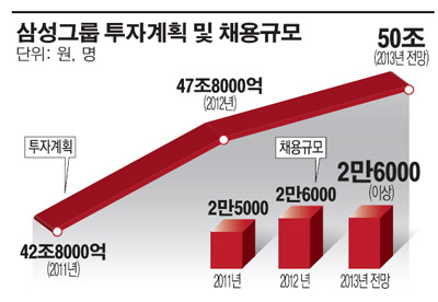 아직 올 한해 투자 및 채용 계획을 확정하지 않았지만 삼성의 투자·채용 규모가 지난해보다 늘어날 것이라는 전망이 지배적인 이유다. 박근혜 정부가 들어서면서 경기 부양을 위해 재계 1위 삼성에 투자 요구를 확대할 것이란 관측도 이같은 전망에 힘을 싣고 있다. 이 때문에 삼성 안팎에선 올해 투자가 50조원을 넘길 것으로 예측하고 있다. 지난해 투자 계획은 47조8000억원이었다.