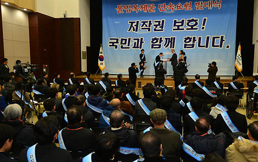 최광식 문화체육관광부 장관이 28일 서울 상암동 문화콘텐츠센터에서 '2013년 불법복제물 단속요원 발대식'에 참석해 모니터링 요원들에게 임명장을 수여하고 있다.