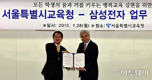 문용린 서울시교육감과 원기찬 삼성전자 사회봉사단장이 28일 오후 서울 종로구 서울시교육청에서 열린 ‘모든 학생의 꿈과 끼를 키우는 행복교육 실현을 위한 서울특별시교육청-삼성전자 업무 협약식’에서 협약식을 마친 뒤, 기념촬영을 하고 있다.
