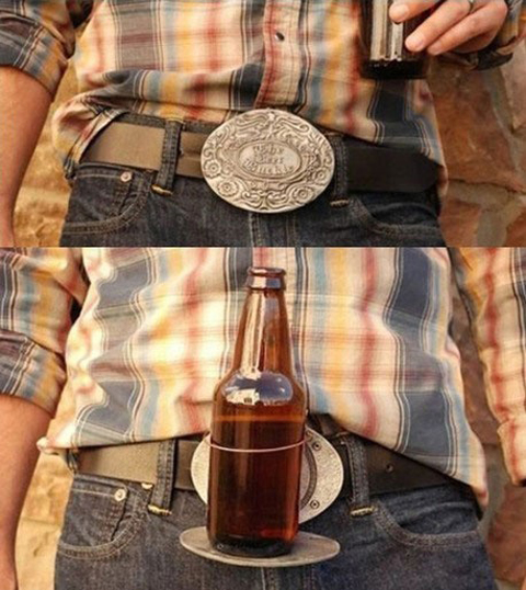 이 벨트는 특이한 기능으로 눈길을 끌었다. 바로 벨트의 버클을 열면 맥주병을 고정시킬 수 있는 기능이 탑재된 것.