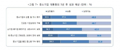 중소기업중앙회는 ‘중소기업인이 바라는 중소기업 대통령에 대한 의견조사’를 실시한 결과 5년 후 성과를 예상에 대한 질문에 응답자 49.9%만 ‘손톱 밑 가시가 제거될 것’이라고 답했다고 29일 밝혔다. ‘건강한 기업생테계 구축’과 ‘소·중·중견기업 성장사다리 실현’ 가능성을 점치는 기업인들은 각각 49.7%, 42%에 불과했다. 특히 ‘대기업과 중소기업의 균형성장과 쌍끌이 경제 실현’에 대해선 34.6%만이 5년 후 가능할 것으로 내다봤다.