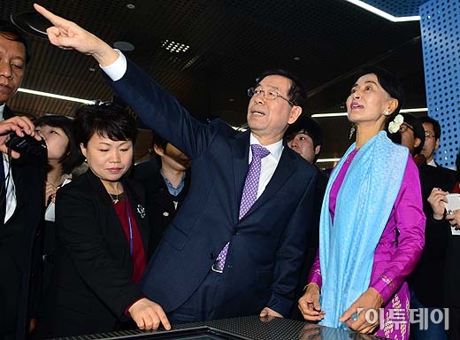 방한 중인 미얀마 민주화 운동의 상징 아웅산 수치 여사가 29일 서울시청을 방문해 박원순 서울시장과 함께 시민청을 둘러보고 있다.