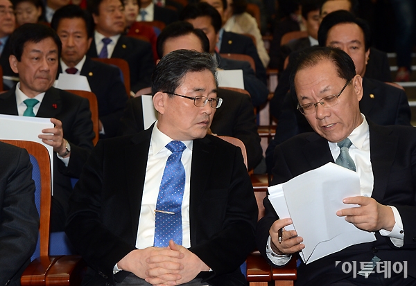 황우여 새누리당 대표와 이한구 원내대표가 30일 오전 국회에서 열린 의원총회에 참석해 이야기를 나누고 있다.