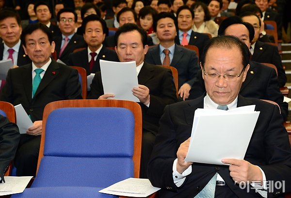 황우여 새누리당 대표가 30일 오전 국회에서 열린 의원총회에 참석해 자료를 살펴보고 있다.