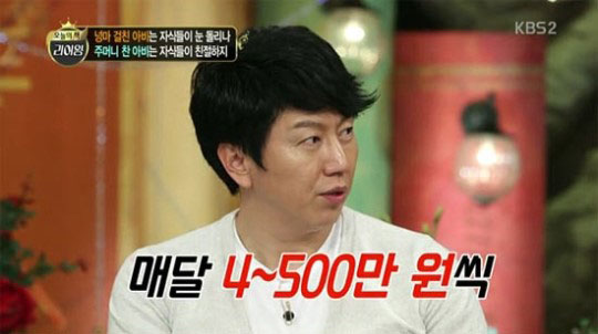 김수로는 KBS 2TV '달빛 프린스'에 출연해 "33세까지 집에서 용돈을 받았다. 한 달에 400~500만원씩 받아서 썼다"고 고백해 눈길을 끌었다. 또 그는 "집에서 내가 달라는 대로 다 줬다. 그땐 용돈 받는 게 당연하다고 생각했다"고 말했다.