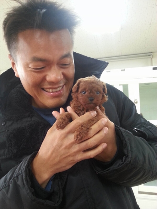 박진영은 갈색 푸들을 향해 흐뭇한 미소를 짓고 있다.