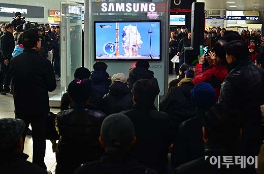 우리나라 첫 우주발사체 나로호(KSLV-Ⅰ)의 3차 발사가 성공했다. 30일 오후 서울역에서 시민들이 나로호 발사 생중계 영상을 지켜보고 있다.