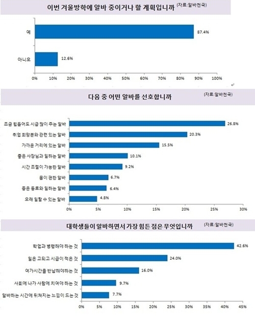 이번 설문조사에서 대학생들은 아르바이트 고충을 묻는 질문에 42.6%가 '학업과 병행해야 하는 것'을 꼽았다.