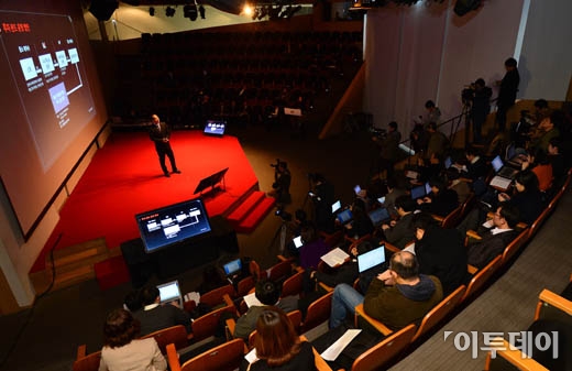 김주성 KT 미디어허브 사장이 31일 오전 서울 광화문 올레스퀘어에서 열린 '콘텐츠 생태계 동반성장 1000억 펀드 조성 기자간담회'에 참석해 브리핑하고 있다.