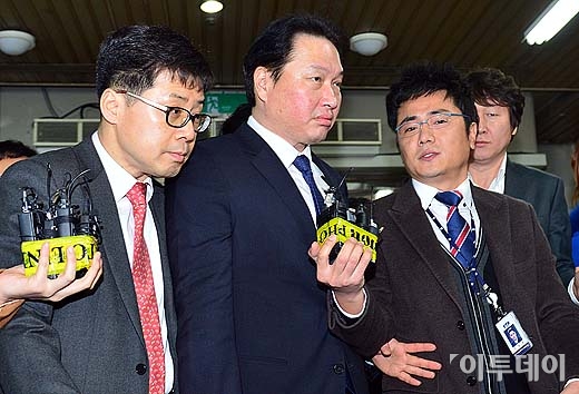계열사에서 선지급 명목으로 497억원을 빼돌리고 비자금 139억5천만원을 조성해 개인 용도로 사용한 혐의로 불구속 기소된 SK 최태원 회장이 31일 오후 선고 공판에 출석하기 위해 서울 서초동 중앙지법으로 들어서고 있다.