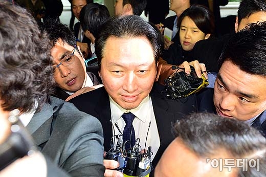 계열사에서 선지급 명목으로 497억원을 횡령하고 비자금 139억5천만원을 조성해 개인 용도로 사용한 혐의로 불구속 기소된 SK 최태원 회장이 31일 오후 선고 공판에 출석하기 위해 서울 서초동 중앙지법으로 들어서고 있다.