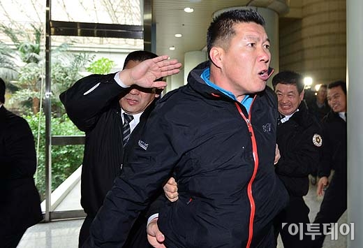 계열사에서 선지급 명목으로 497억원을 빼돌리고 비자금 139억5천만원을 조성해 개인 용도로 사용한 혐의로 불구속 기소된 SK 최태원 회장이 31일 오후 선고 공판에 출석한 가운데 한 시민이 최 회장의 뒤를 따르며 "최태원을 구속하라"는 구호를 외치고 있다.