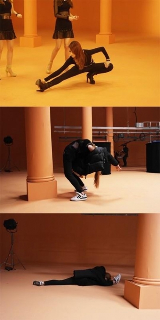 공개된 '나인뮤지스 뮤비 촬영장' 사진에는 스트레칭을 하며 몸을 푸는 현아와 경리의 모습이 담겨 있다. 이들은 '모델돌'이라는 수식어에 걸맞게 쭉 뻗은 긴 팔다리를 과시해 시선을 집중시켰다.