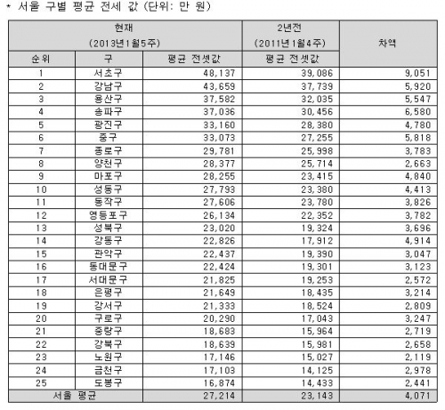 지난 2011년 1월 서울 전체 구에서 평균 전셋값이 가장 높은 지역은 서초구(3억 9086만원), 가장 낮은 지역은 금천구(1억 4125만원)로 두 지역간 전세값의 차이는 2억 4961만원이었다.