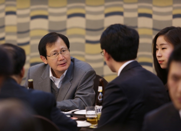 ▲박찬구 금호석유화학 회장이 1일 서울로얄호텔에서 진행된 '2013년 상반기 신입사원 환영오찬’ 행사에서 신입사원과 담소를 나누고 있다.