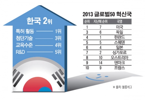 블룸버그는 연구개발(R&D) 투자·생산성·첨단기술 투자·인구당 연구원 비율·제조역량(GDP 대비 고부가가치 제품 생산 비중)·교육수준·특허활동 등 7가지 항목으로 세계 각국의 혁신 정도를 평가했다고 설명했다.