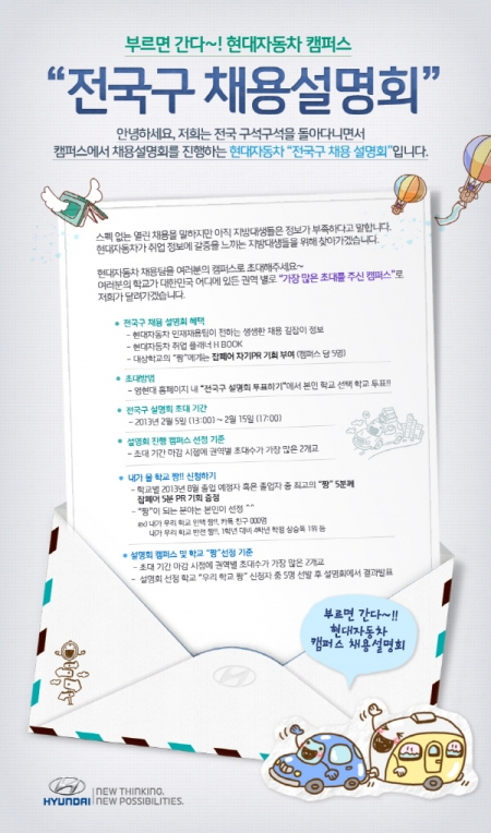 현대차는 2월 중 영현대 홈페이지를 통해 채용설명회 대상 학교를 선정, 발표하고 3월 중 해당 학교를 찾아가 전국구 채용설명회를 실시할 예정이다.