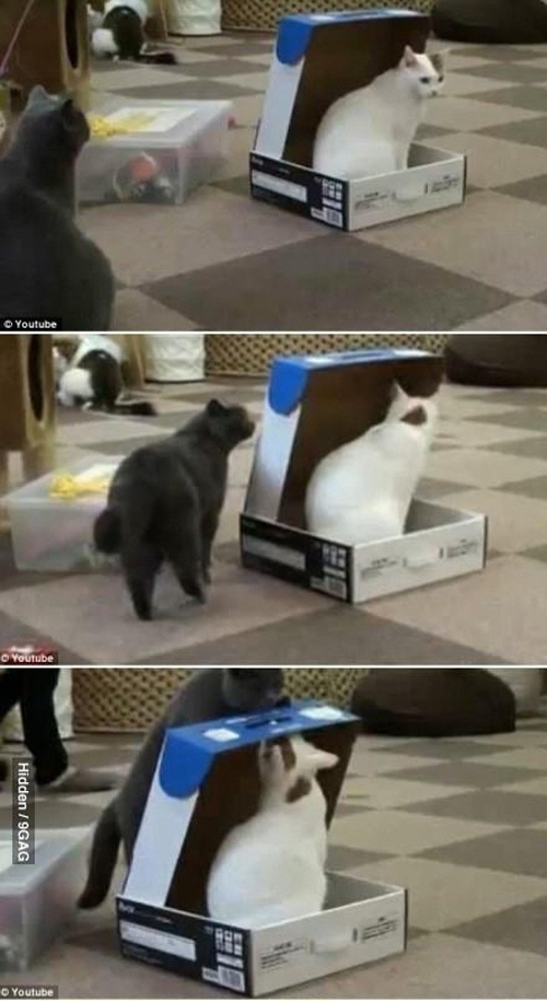 공개된 영상에는 뚜껑이 열려있는 상자안에 흰색 고양이가 들어가 있는데 갑자기 회색 고양이가 다가오더니 뚜껑을 덮어버리는 모습이 담겨 있다.