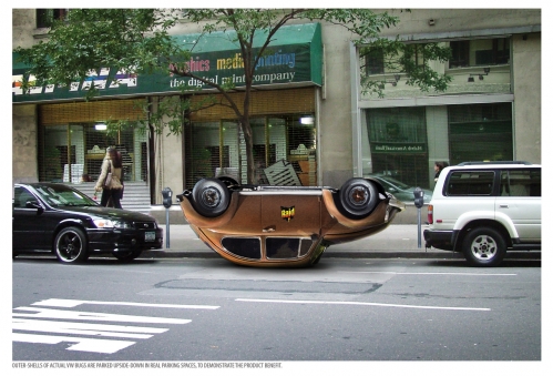 대표작이 살충제 광고다. 그는 주차된 차 사이에 독일 폴크스바겐의 '비틀'을 뒤집어 놓아 마치 살충제에 벌레가 뒤집혀 죽은 듯한 모습을 연상케 했다. '비틀'을 벌레(BUG)에 비유한 발상이다.