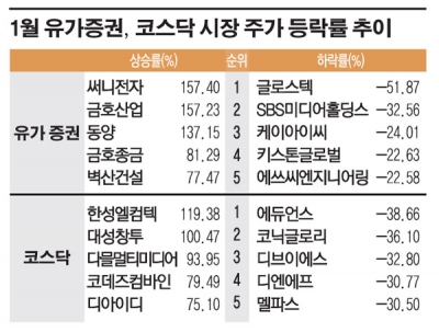 5일 한국거래소에 따르면 유가증권 시장(우선주 제외)에서 지난해 말 대비 최근 한달간 써니전자와 금호산업이 각각 157.40%, 137.15% 급등하며 1위와 2위를 차지했다.
