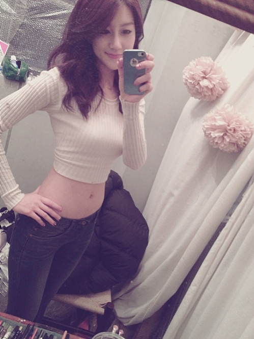 사진 속 오승아는 거울을 통해 비친 자신의 모습을 카메라에 담았다. 배꼽이 드러난 하얀 니트에 스키니진으로 완벽한 S라인을 뽐내고 있다.