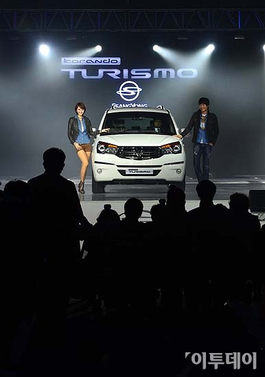 쌍용자동차가 5일 오전 서울 강남구 대치동 서울무역전시장(SETEC)에서 SUV 스타일링과 성능, 승용차의 안락함, 다양한 활용성 등을 겸비하여 새롭게 탄생한 프리미엄 MLV(Multi Leisure Vehicle:다목적 레저차량) ‘코란도 투리스모’를 선보이고 있다.