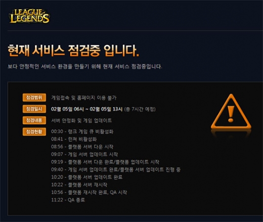 5일 오전 6시부터 시작된 롤 점검은 이날 오후 1시까지 예정됐다. 하지만 오후 2시가 넘은 이 시각까지 점검이 계속되고 있어 사용자들의 불만이 커지고 있다. 아직 라이엇게임즈는 서버점검 연장에 대한 별다른 공지를 전하고 있지 않고 있으며 홈페이지 접속도 원할하지 못한 상태다.