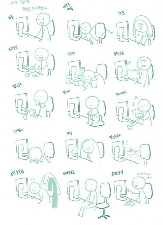 공개된 사진에는 다양한 자세로 컴퓨터를 하는 갖가지 유형이 나열되어 있다. 허리를 곧게 펴고 정면으로 모니터를 바라보고 있는 '기본형부터 옆으로 거의 드러누워 컴퓨터를 하는 '아크로바틱'형, 밥을 먹는 동시에 컴퓨터를 하는 '진수성찬'형, 컴퓨터를 켜놓고 자는 '간이침실' 유형까지 총 15가지의 다양한 자세가 나열되어 있다.